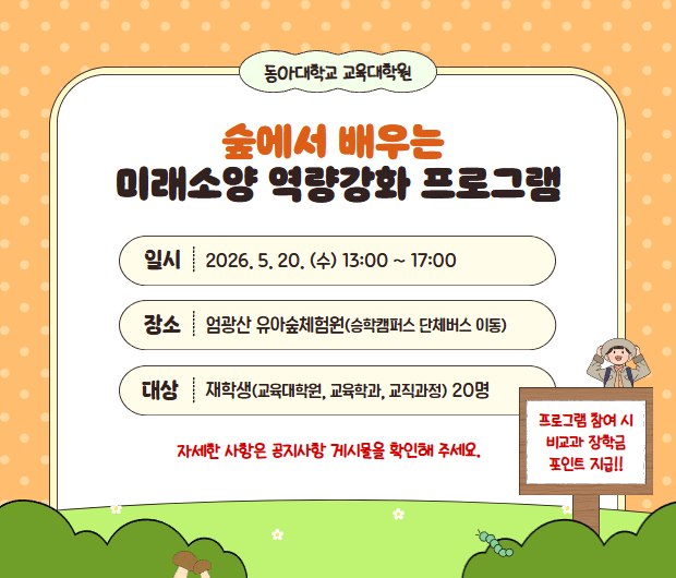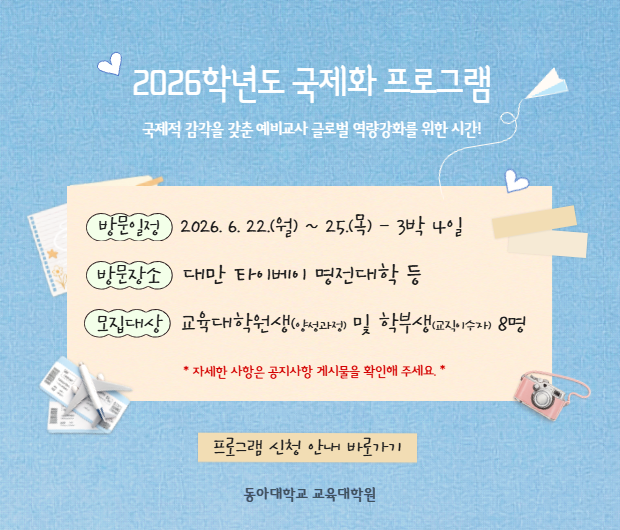 팝업존 이전 장면 01 다음 장면 정지 재생 SEARCH 검색 통합정보시스템 서식함 가상대학 증명서발급 찾아오시는길 학위논문 작성안내 연구보고서 작성안내 NOTICE 공지사항 더보기 연구원 공지사항 더보기 미래 사회를 선도하는 교육대학원으로, 교직 전문성과 미래 역량을 함께 키우는 곳 Dong-A Graduate School of Education 보러가기 교육연수원 규정 교육연수원 규정 더보기